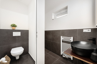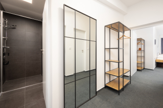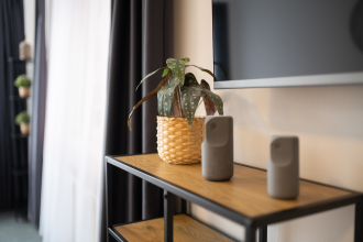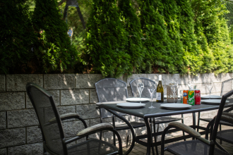 Prostorný apartmán o rozloze 33 m², až pro 3 osoby. Nabízí útulnou ložnici s manželskou postelí a jednolůžkovou postelí, koupelnu se sprchovým koutem a plně vybavenou kuchyňku. Součástí vybavení pokoje je skříň, konferenční stolek, židle, televize a bezplatná Wi-Fi. Apartmán disponuje také vlastní terasou s posezením, ideální pro relaxaci.