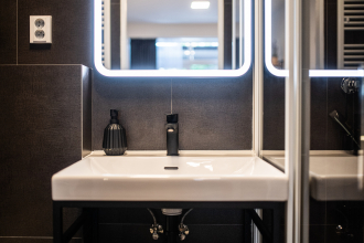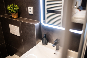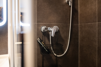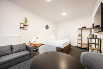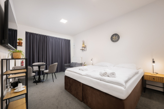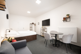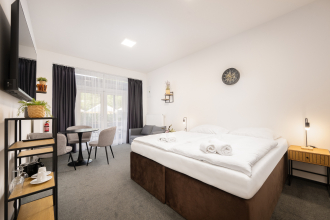 Menší apartmán o rozloze 20 m² pro 2 osoby. Nabízí útulné prostředí s manželskou postelí, vlastní koupelnou se sprchovým koutem a základním vybavením. V apartmánu je také skříň, konferenční stolek, židle, televize a bezplatná Wi-Fi.