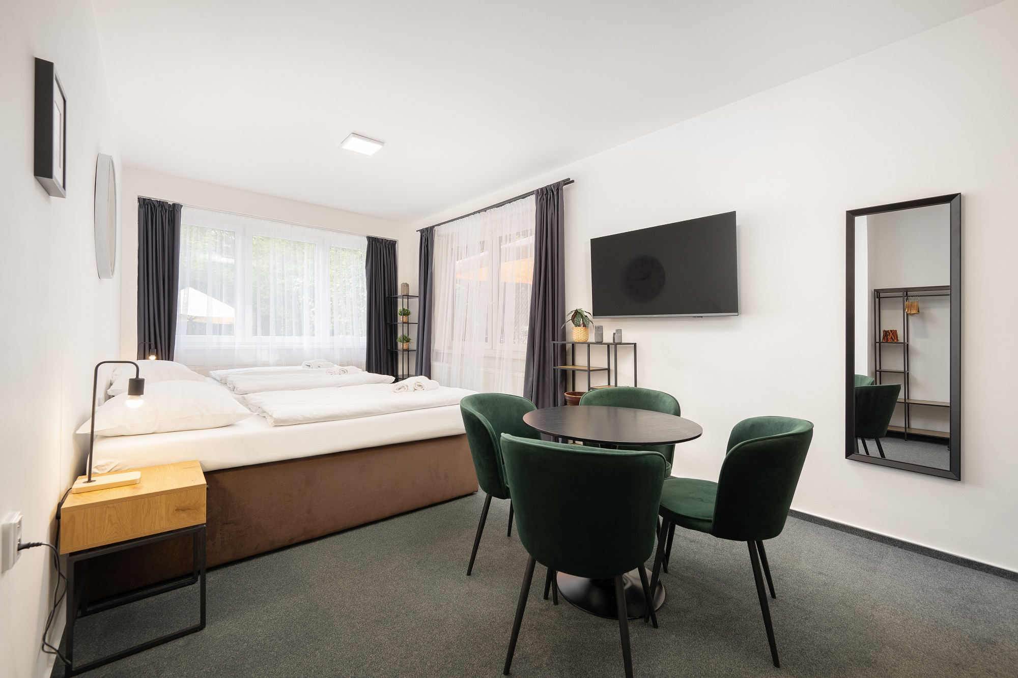 Menší apartmán o rozloze 20 m² pro 2 osoby. Nabízí útulné prostředí s manželskou postelí, vlastní koupelnou se sprchovým koutem a základním vybavením. V apartmánu je také skříň, konferenční stolek, židle, televize a bezplatná Wi-Fi.